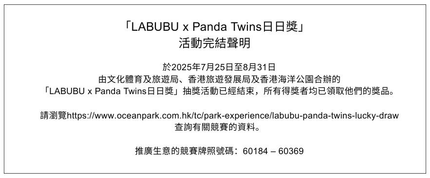 港產大熊貓龍鳳胎家姐「加加」和細佬「得得」即將迎來一歲生日!為了慶祝這個特別日子,文化體育及旅遊局、香港旅遊發展局及香港海洋公園合辦「LABUBU x Panda Twins日日獎」,召集世界好友一齊分享喜悅,無論你是香港居民還是訪港旅客都可以參加!